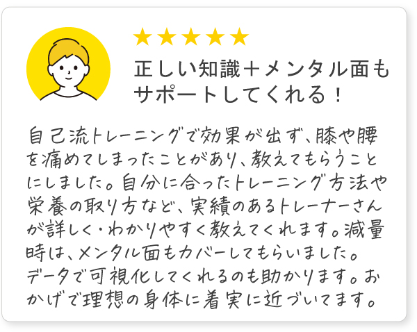 あなたの体の状態や筋力に合わせ、安全かつ効果的なトレーニングを進めていただくために。専門のトレーナーがストレッチや日常動作などご自身で取り組める内容を含めたトレーニング指導やアドバイスを提供します。